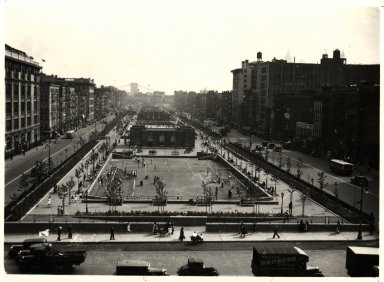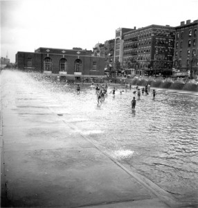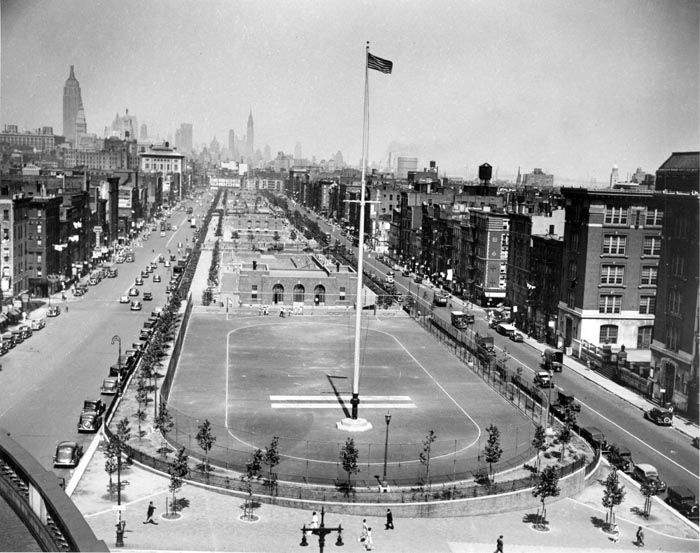 The parkland was acquired by the City in 1929 for the purpose of widening Chrystie and Forsythe Streets and building low-cost housing but was later set aside for “playgrounds and resting places for mothers and children.” The construction of the park in 1934 was the largest park project on the Lower East Side since the acquisition of Tompkins Square Park a century earlier. Parts of four streets were closed (Hester, Broome, Rivington, and Stanton) to accommodate seven distinct play areas with separate playgrounds for boys and girls, as well as two wading pools, a roller skating rink and a perimeter of benches and shade trees.
